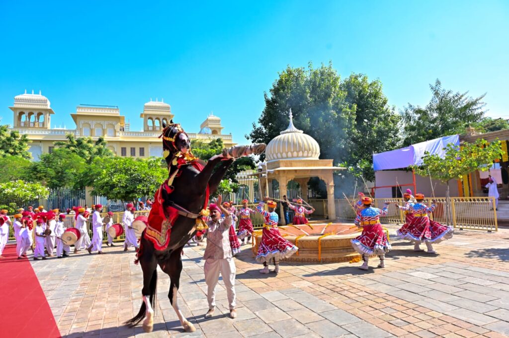 आरती के उपरांत सुमधुर ‘भजन संध्या’ का आयोजन भव्यता और अध्यात्म के अनुपम संगम के रूप में सम्पन्न हुआ। इस अवसर पर छतांगढ़, जैसलमेर से आए अंतरराष्ट्रीय ख्याति प्राप्त मेघवंशी कलाकार महेशाराम एवं उनकी प्रतिष्ठित मंडली ने देवी-भक्ति पर आधारित विविध रागों और सुरों से सजी मनोहारी प्रस्तुतियाँ दीं। उनकी अद्वितीय गायकी, मधुर ताल-लय और भक्ति-रस से ओतप्रोत स्वर-लहरियों ने वातावरण को आध्यात्मिक भावों से सराबोर कर दिया।